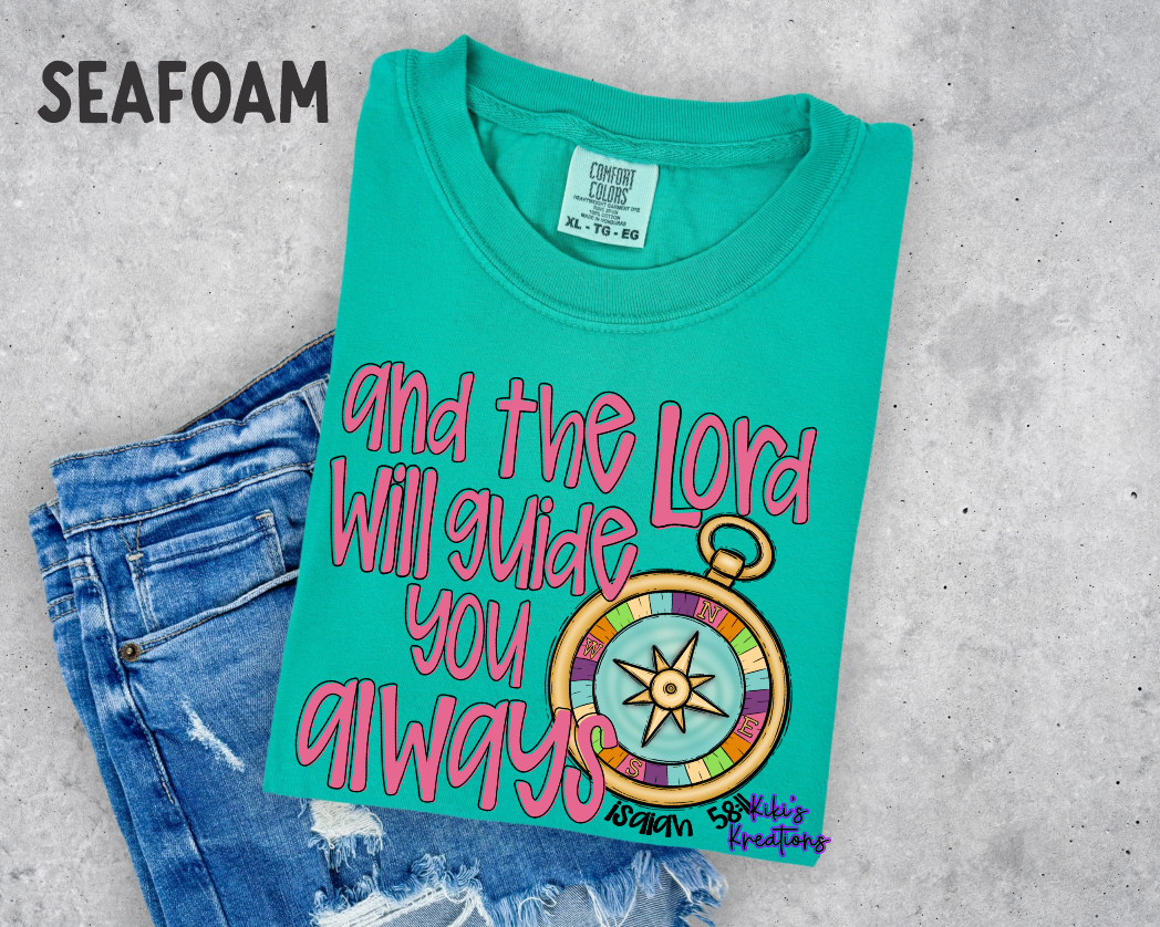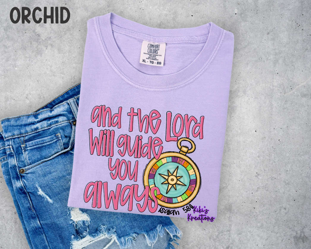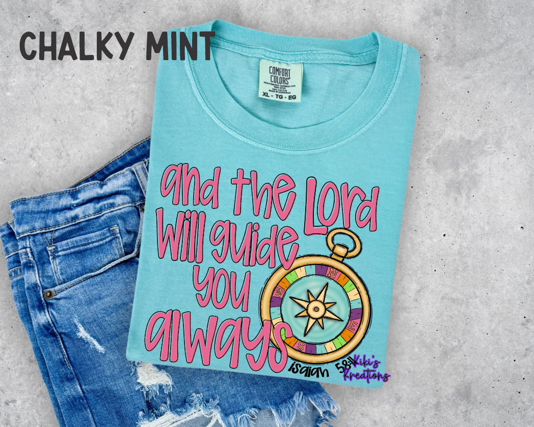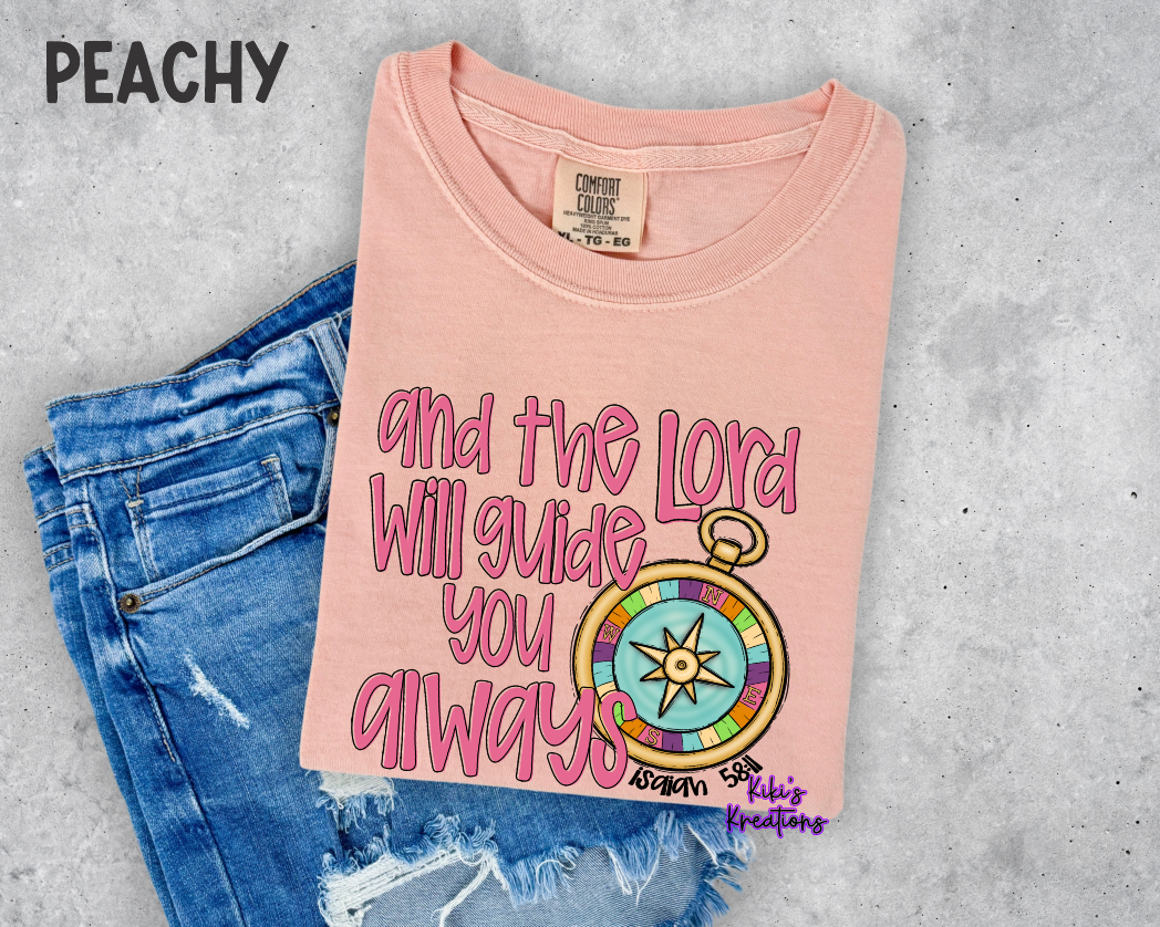 Stay on course with the AND THE LORD WILL GUIDE YOU ALWAYS tee. Featuring a colorful compass graphic and scripture from Isaiah 58:11, this Comfort Colors tee serves as a reminder to trust in the Lord's guidance. Made with high quality fabric for comfort and durability.
