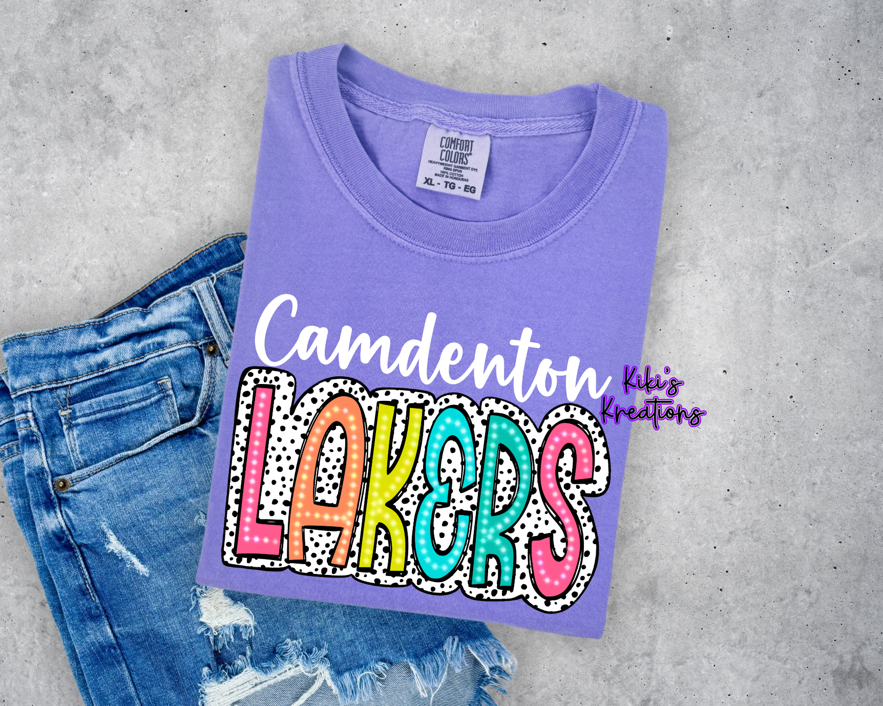 Experience ultimate comfort and style with the CAMDENTON LAKERS DOTTIE COMFORT COLORS TEE. Made with high-quality materials, this tee offers durability and breathability. Perfect for any occasion, show off your team spirit and stay comfortable all day long. Available now.