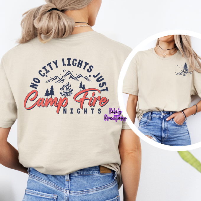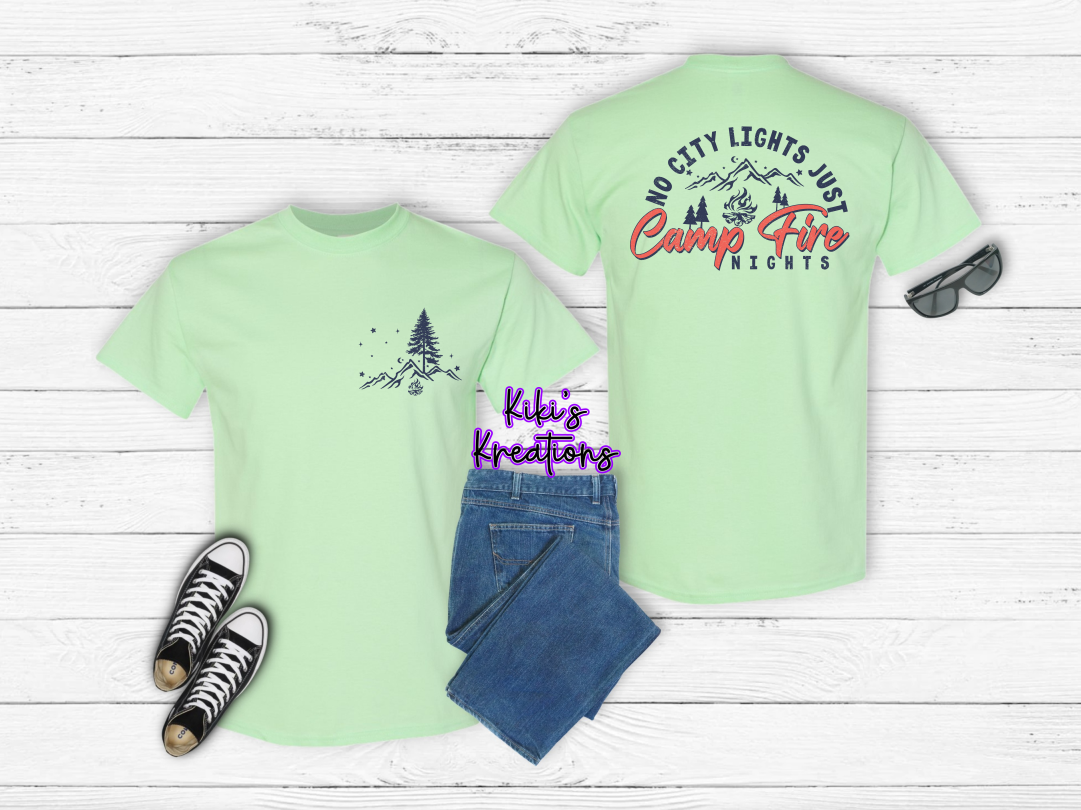 Experience the beauty of nature with our CAMP FIRE NIGHTS t-shirt. No city lights, just the calming glow of a campfire night. Made from Gildan Softstyle material for ultimate comfort. Perfect for your next outdoor adventure.