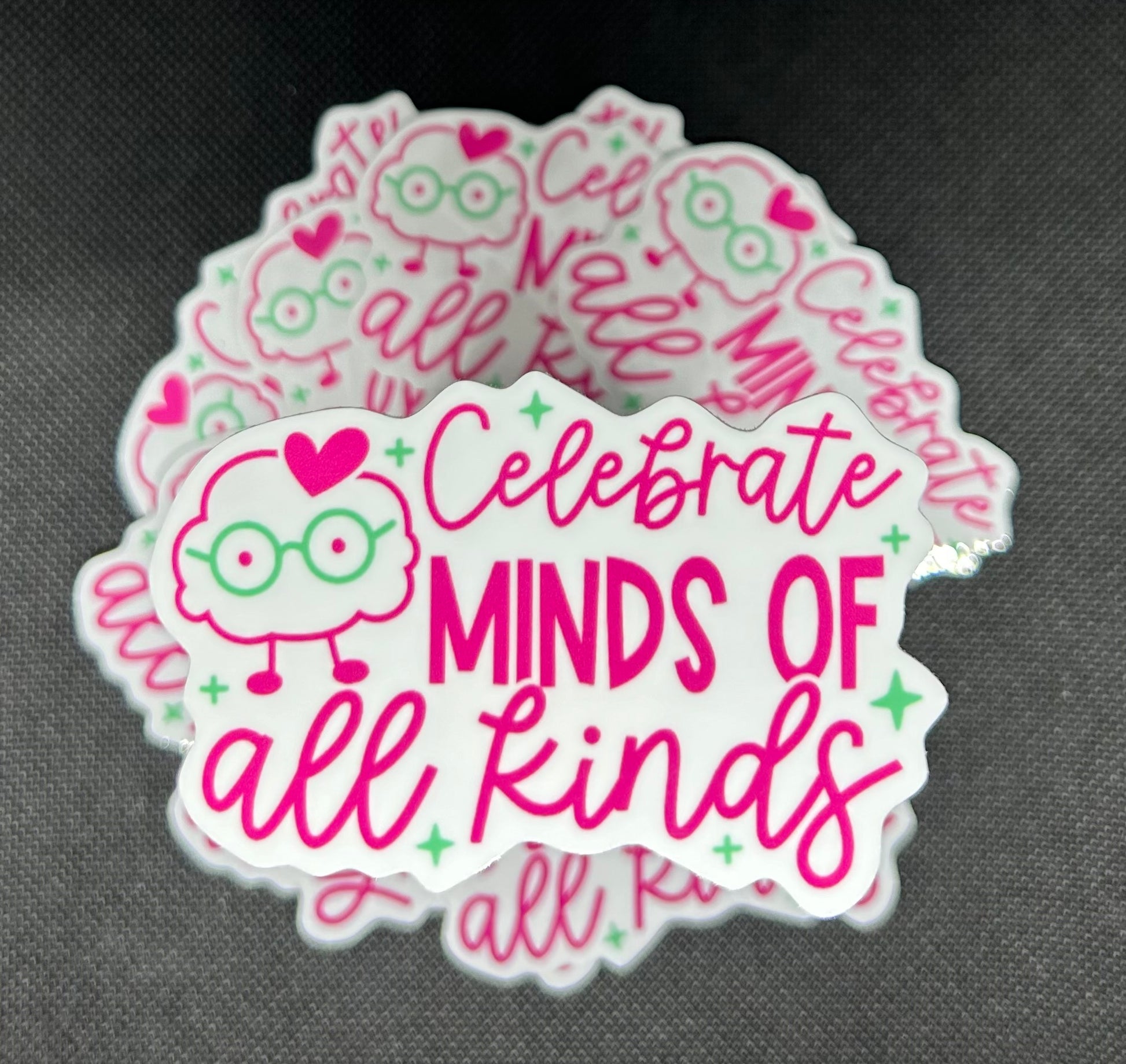 "Show your support for diversity and inclusion with our CELEBRATE MINDS OF ALL KINDS sticker. Featuring a mint and pink design and measuring 3 inches, it's perfect for laptops, water bottles, and more. Let your sticker do the talking and promote acceptance and understanding wherever you go."