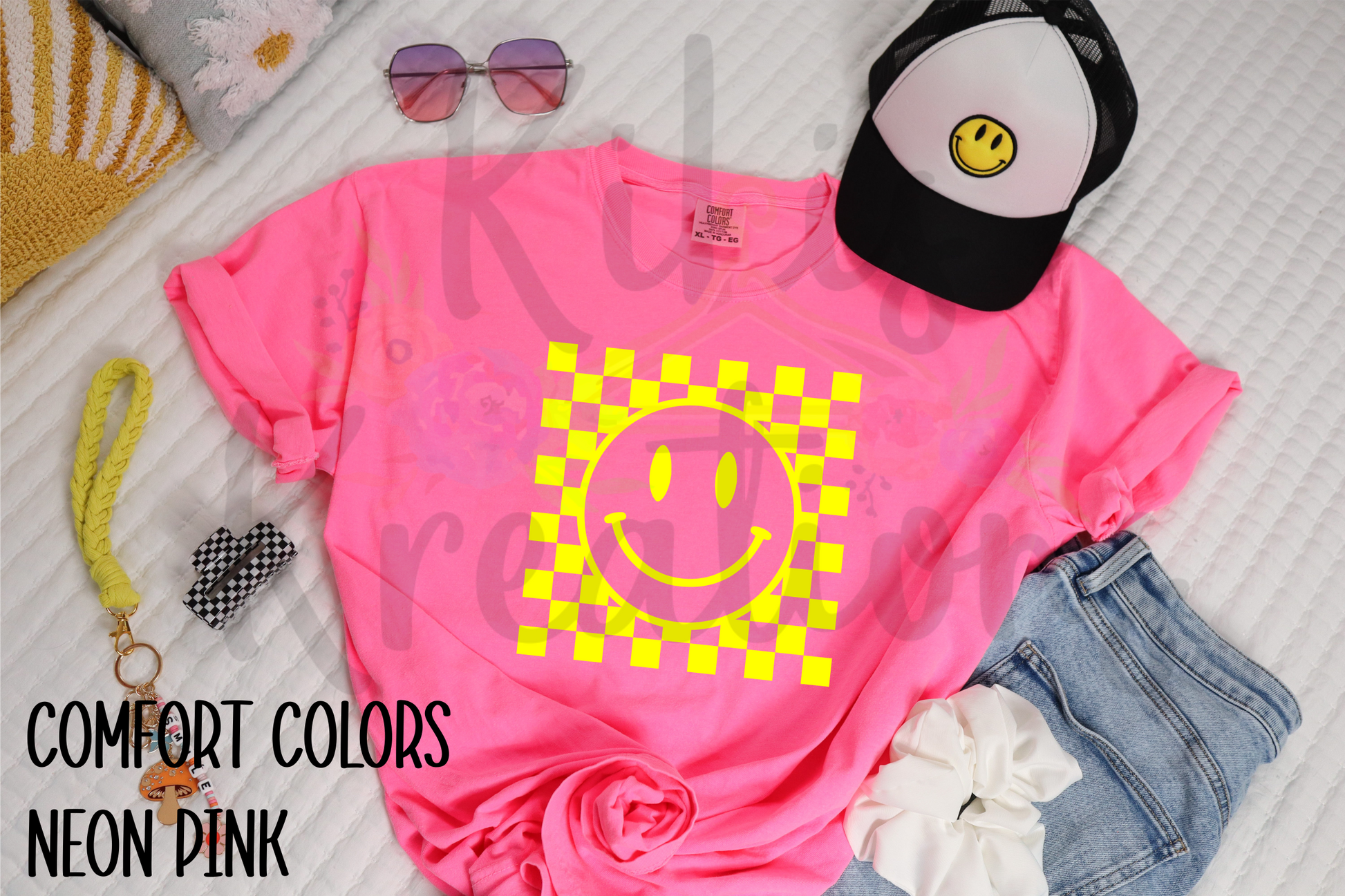 Make a statement with the Checkered Smiley. Featuring Comfort Colors and neon pink, this tee is sure to become your new favorite go-to. The bold checkering and cheery smiley face provide a fun look that will stand out in any crowd.