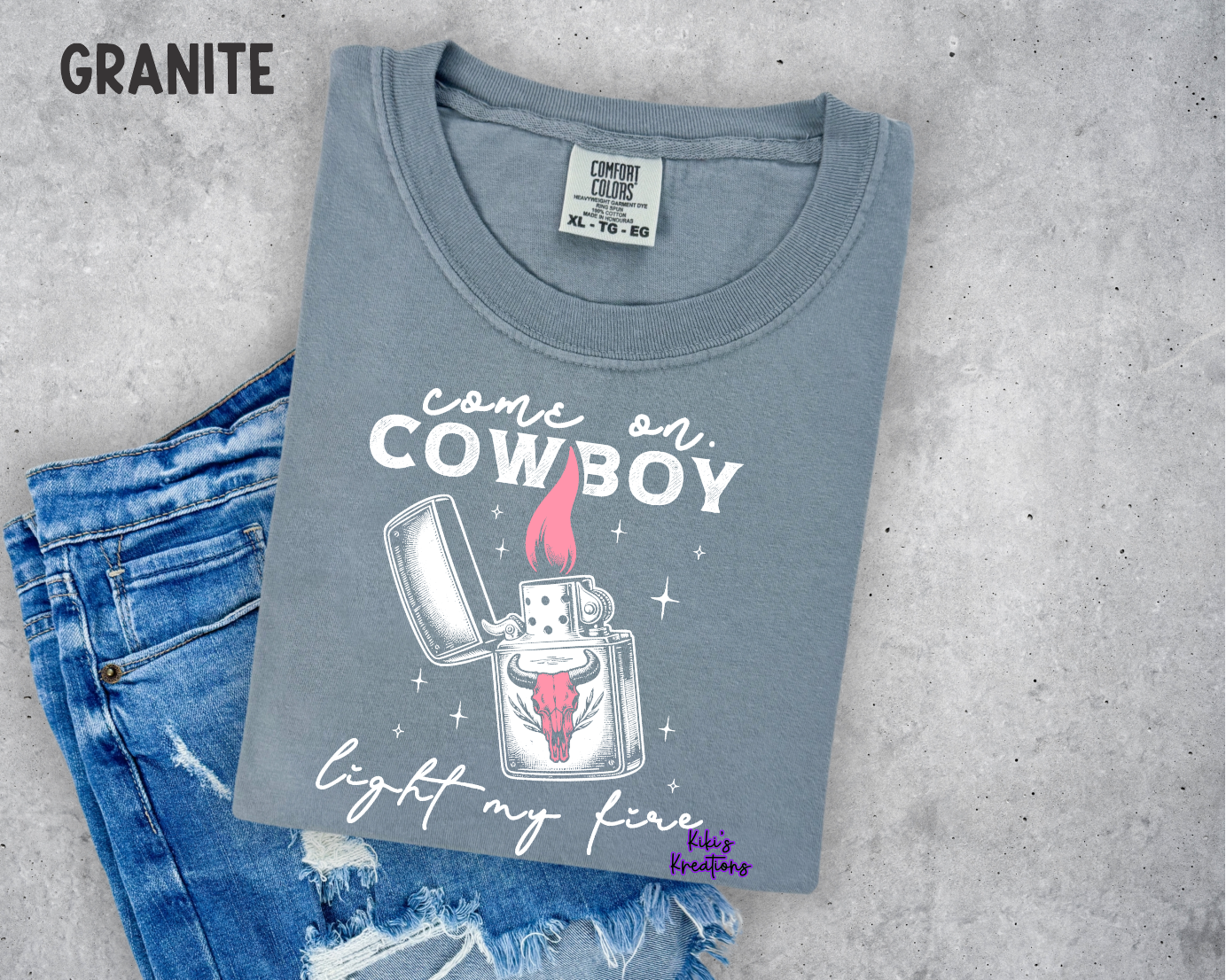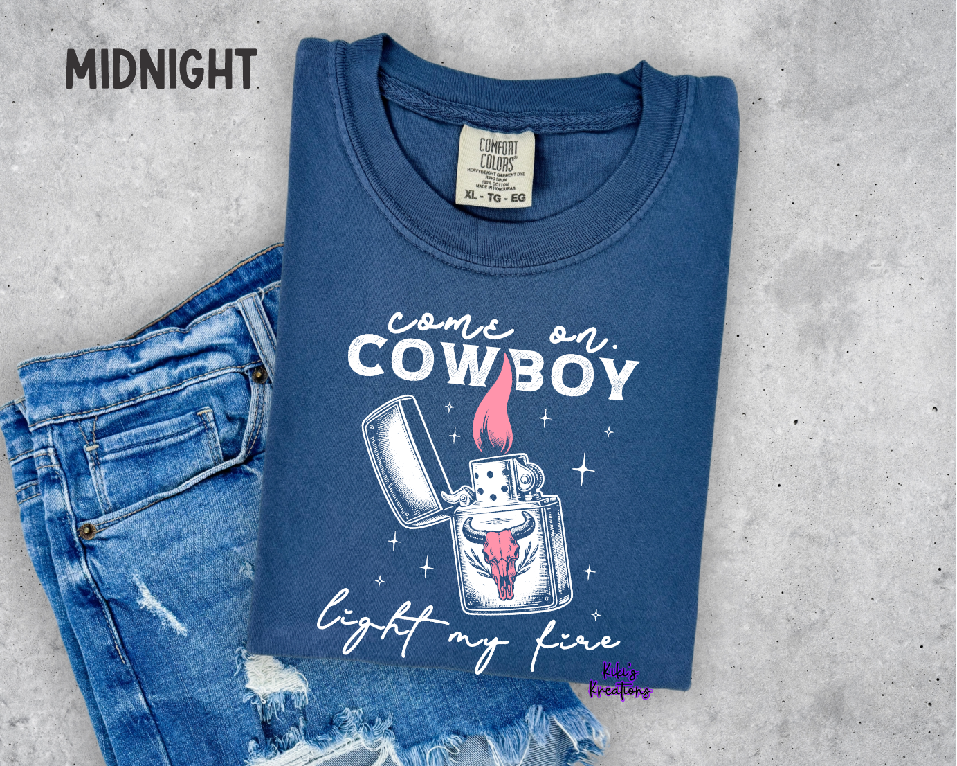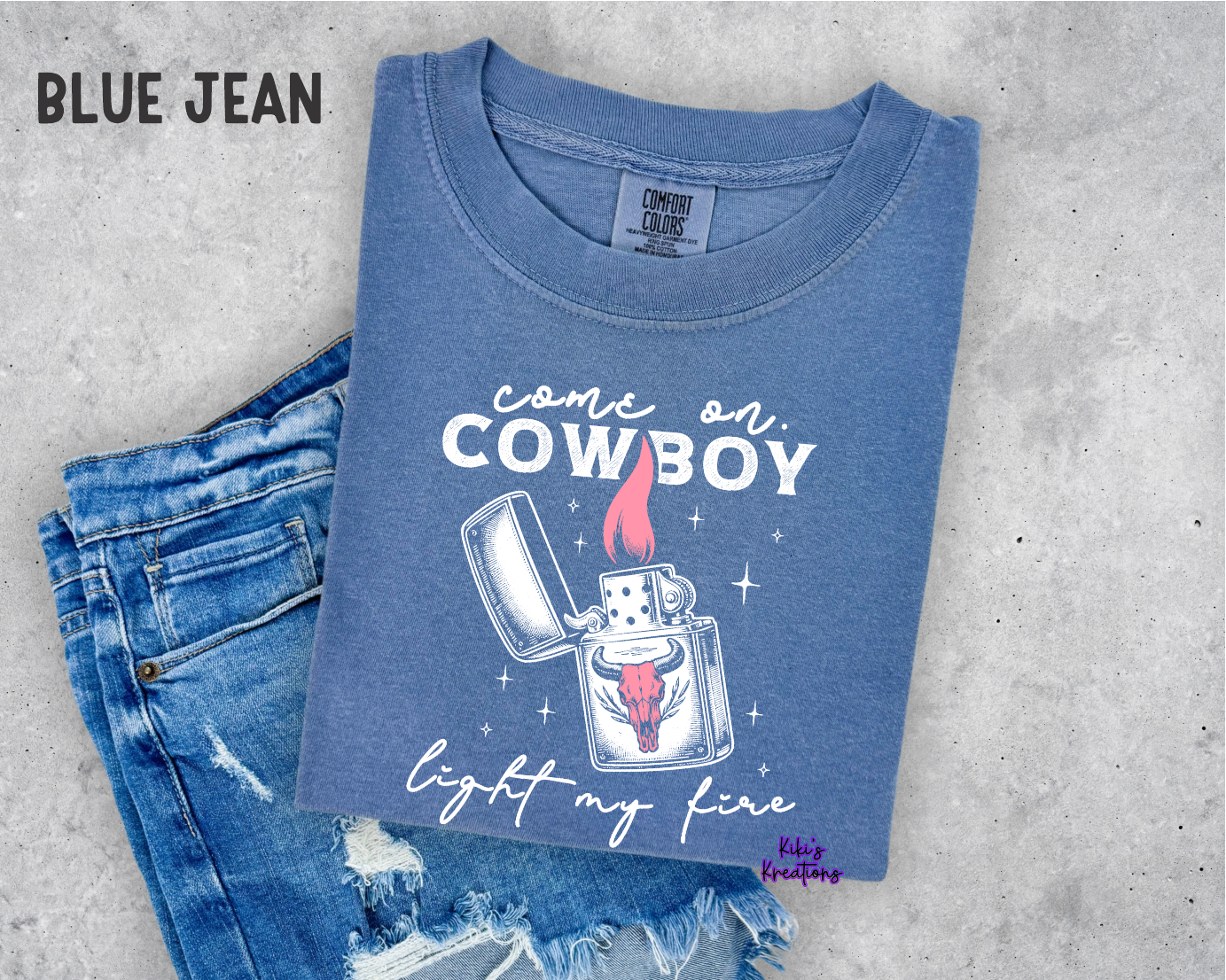 This COME ON COWBOY LIGHT MY FIRE t-shirt features a unique graphic design and is made with Comfort Colors material for ultimate comfort. Show off your style and make a statement with this eye-catching, high-quality tee. Perfect for any cowboy or cowgirl looking to light up their wardrobe.