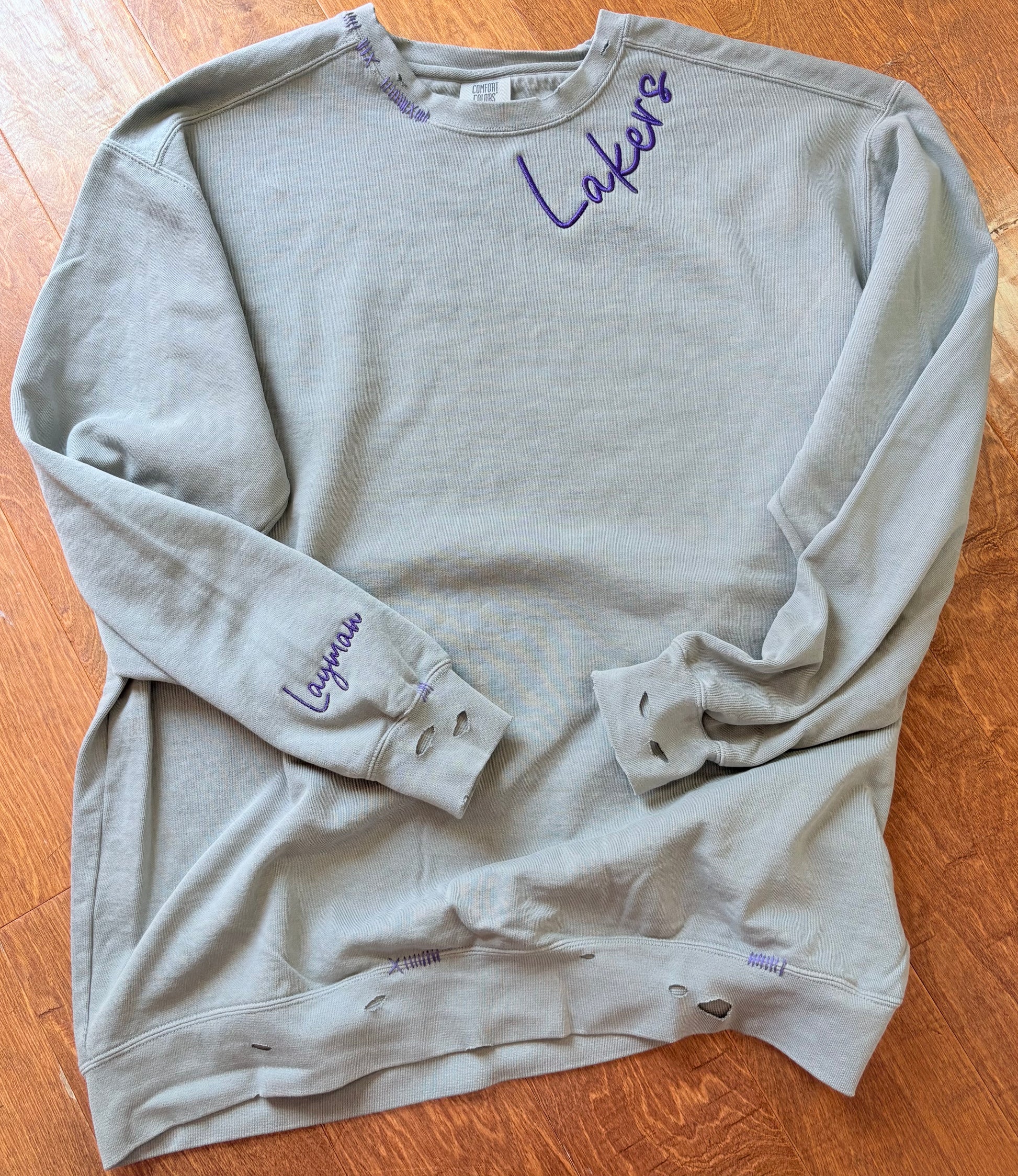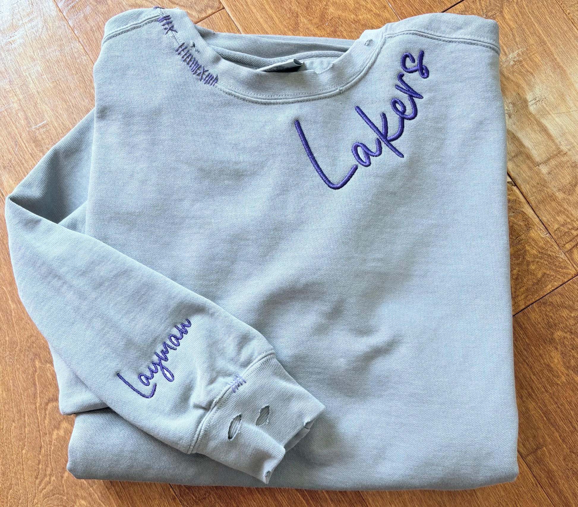Your mascot machine embroidered on neckline. Hand-stitched accents and cuts made.