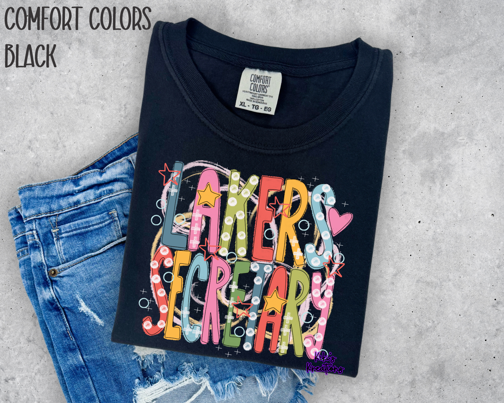 This FUNKY LAKERS SECRETARY tee is a fun and colorful addition to your wardrobe. Made with comfortable Comfort Colors material, it's perfect for showing off your team pride. With its unique design and high-quality construction, this tee is a must-have for any fan.