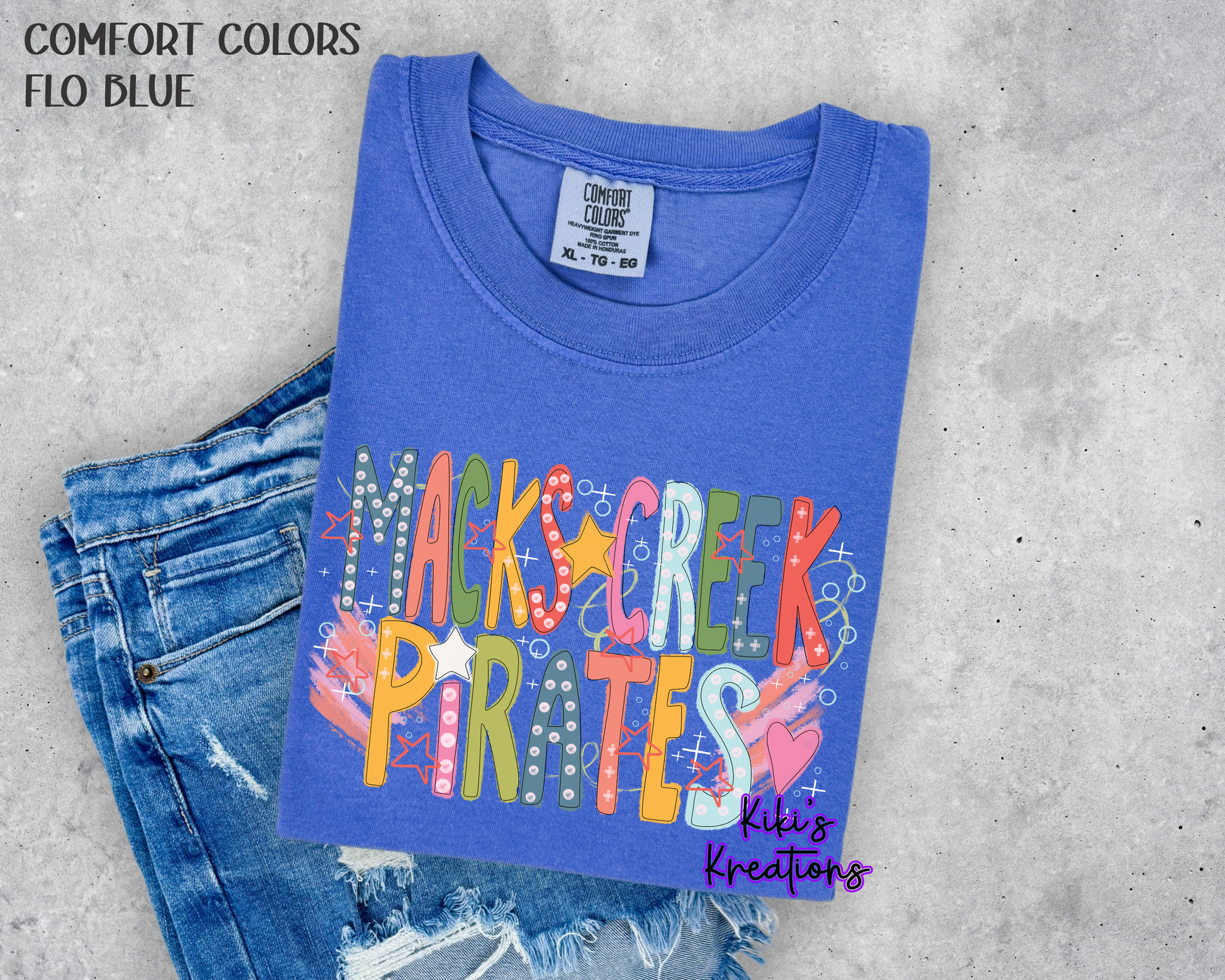Upgrade your wardrobe with the FUNKY MACKS CREEK PIRATES t-shirt. Featuring a unique FUNKY FONT and made with ultra-soft Comfort Colors fabric, this tee is not just stylish but also comfortable. Perfect for any occasion, show off your love for the MACKS CREEK PIRATES in style.
