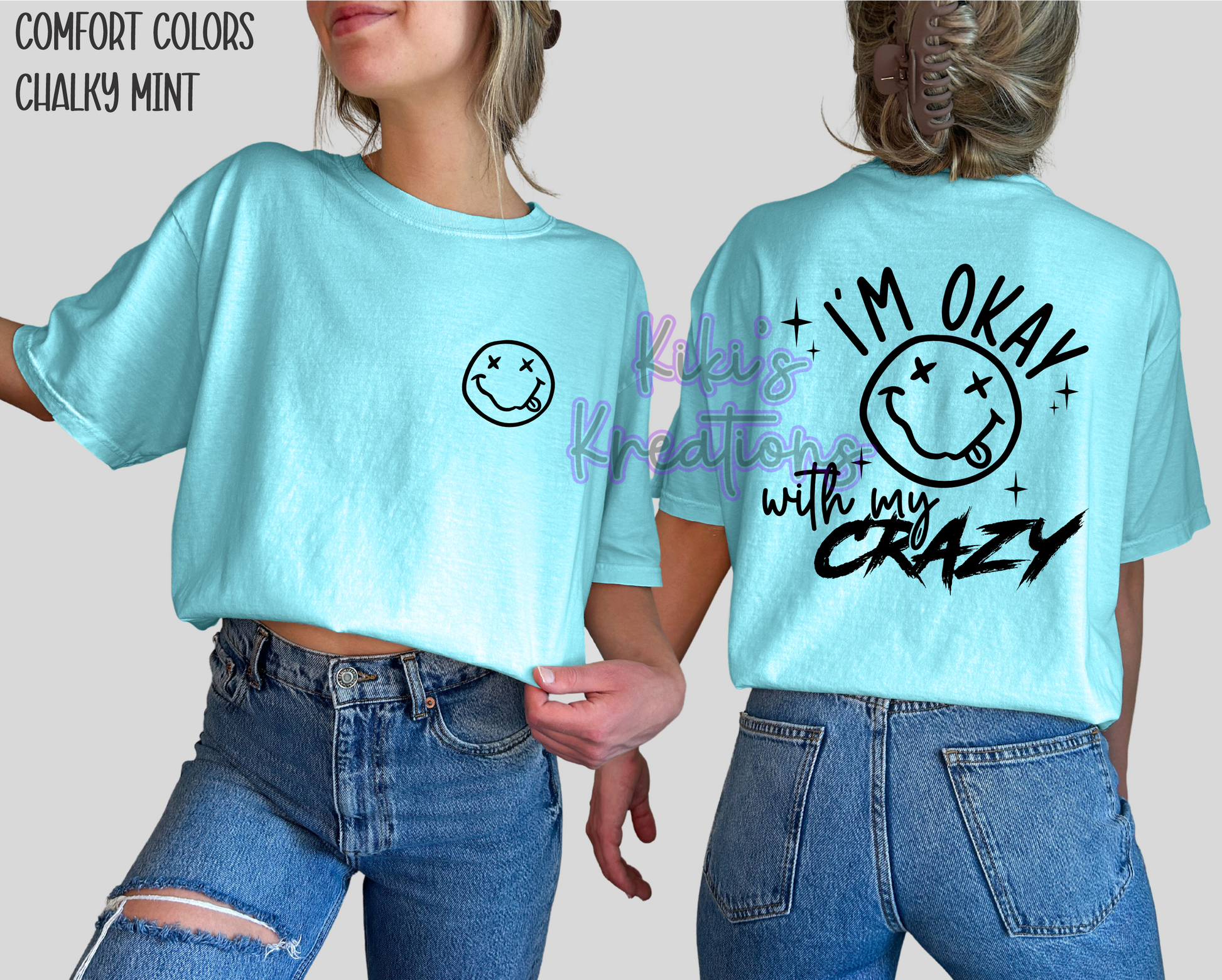 Express your self-acceptance with an IM OKAY WITH MY CRAZY Comfort Colors Tee. Made from soft, high-quality fabric, this tee features a smiley face graphic that adds a touch of personality to your outfit. Perfect for everyday wear or a casual statement piece.