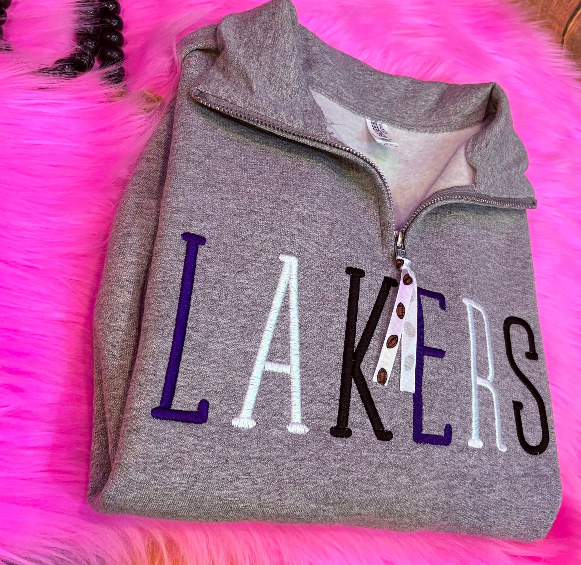 This Jerzee unisex pullover features an embroidered Lakers or any mascot design, crafted for both style and comfort. The quarter-zip allows easy layering and temperature control, making it ideal for casual wear or game days. With a versatile fit and durable fabric, this pullover offers lasting performance while showcasing team pride.