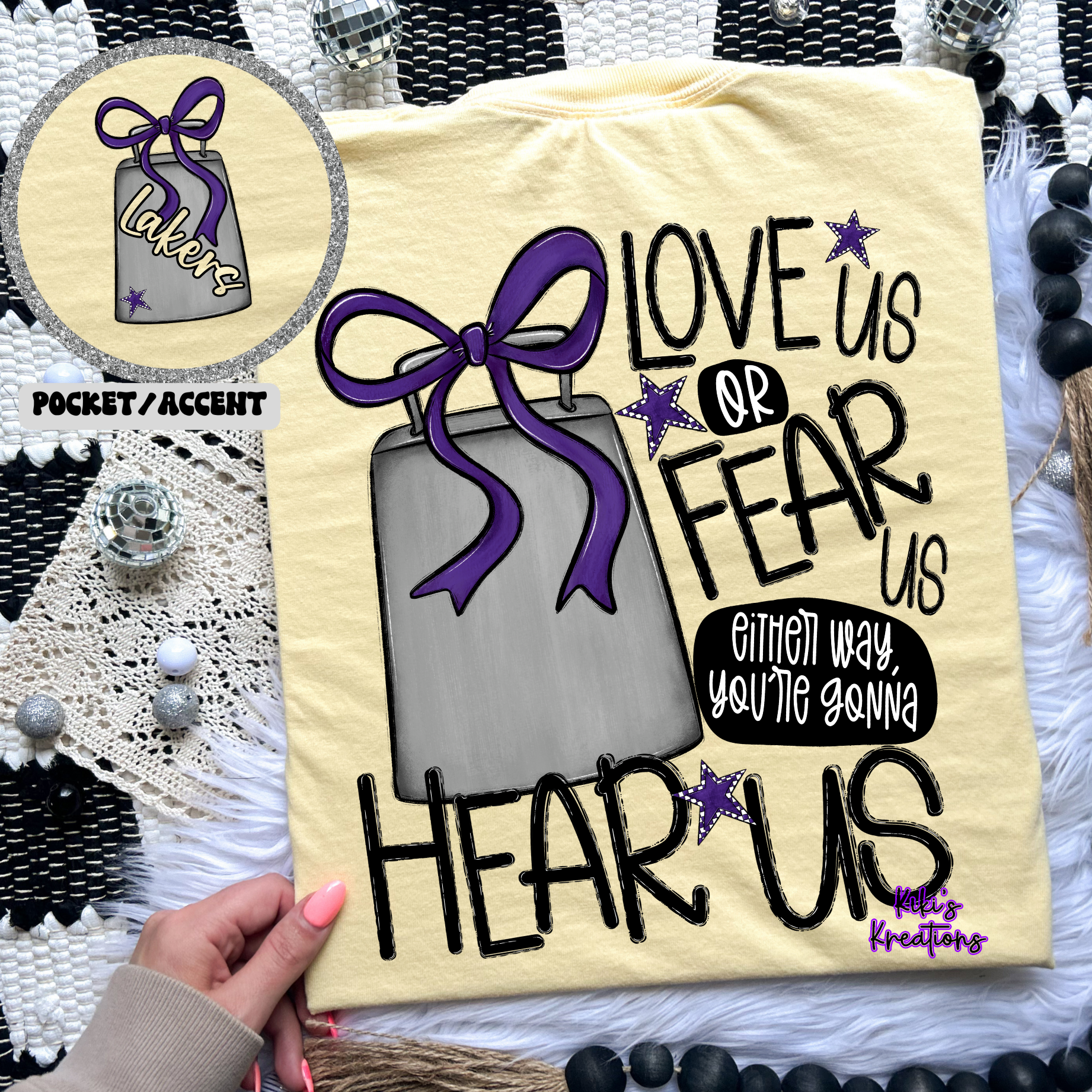 Show off your love for your team with the LOVE US OR FEAR US COWBELL. With a bold design, this cowbell is sure to make a statement at any game. Made of high-quality Comfort Colors material, this tee is both comfortable and durable, perfect for showing your LAKERS pride. Get yours today and let your SCHOOL SPIRIT be heard!