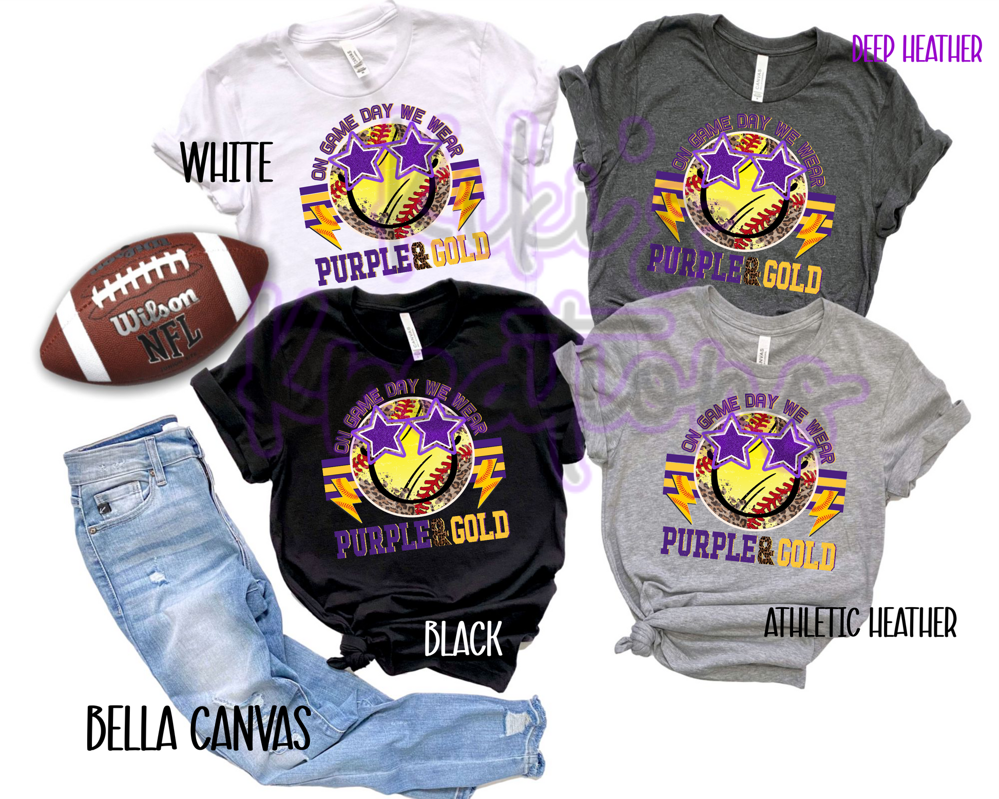 Show your team spirit with this ON GAME DAY Softball Bella Canvas tee! With vibrant purple and gold colors, you'll be ready to cheer for your team no matter the occasion. Experience the comfortable fit of a Bella Canvas tee and announce to the world: Go Softball!