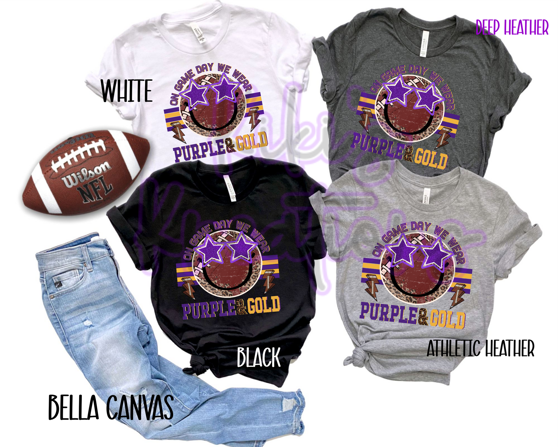 Show your team spirit on game day with this purple and gold-themed Bella Canvas tee. Its unique design features a football and a smiley face, making it a great choice for the enthusiastic fan. Get your ON GAME DAY WE WEAR PURPLE AND GOLD shirt now!