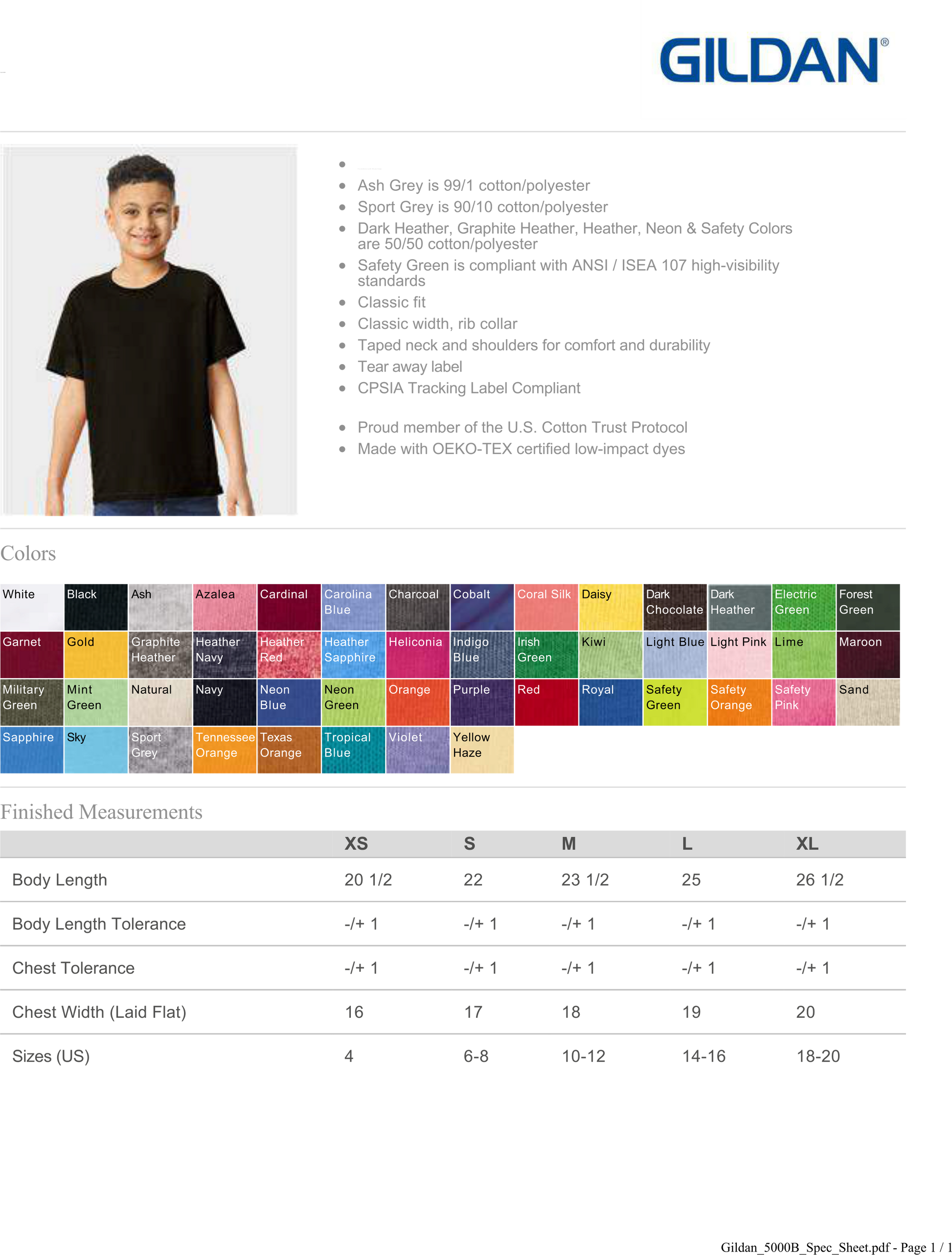 - Dark Heather, Graphite Heather, Heather, Neon & Safety Colors are 50/50 cotton/polyester