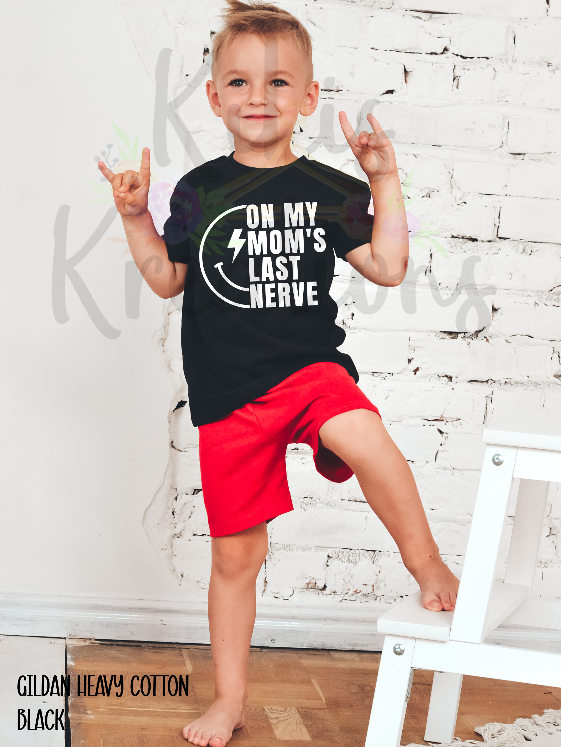 Made of Gildan Softstyle fabric, ON MY MOMS LAST NERVE T-shirt for kids offers ultimate comfort with a softer feel and lightweight construction. Durable and easy to care for, this youth apparel provides the perfect fit for your child's active lifestyle.