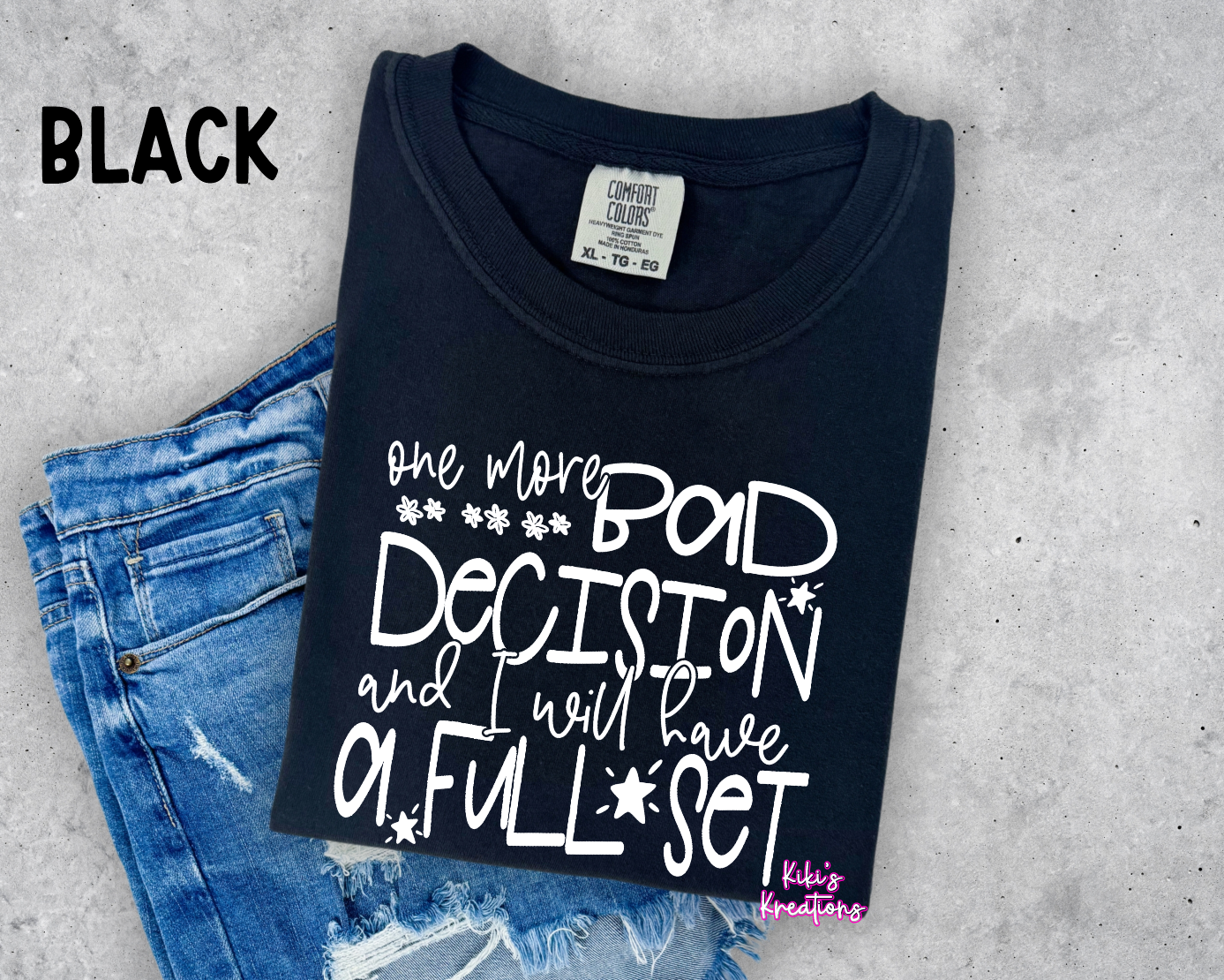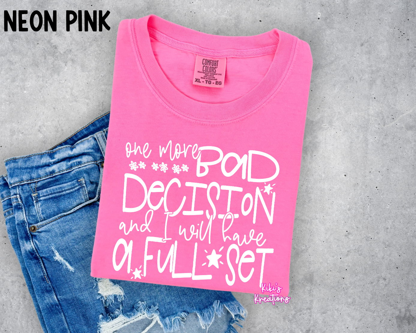 Upgrade your wardrobe with the ONE MORE BAD DECISION graphic tee. Made with comfort colors and featuring a touch of sarcasm, this tee is sure to be a hit. Complete your collection with this one-of-a-kind, funny t-shirt.