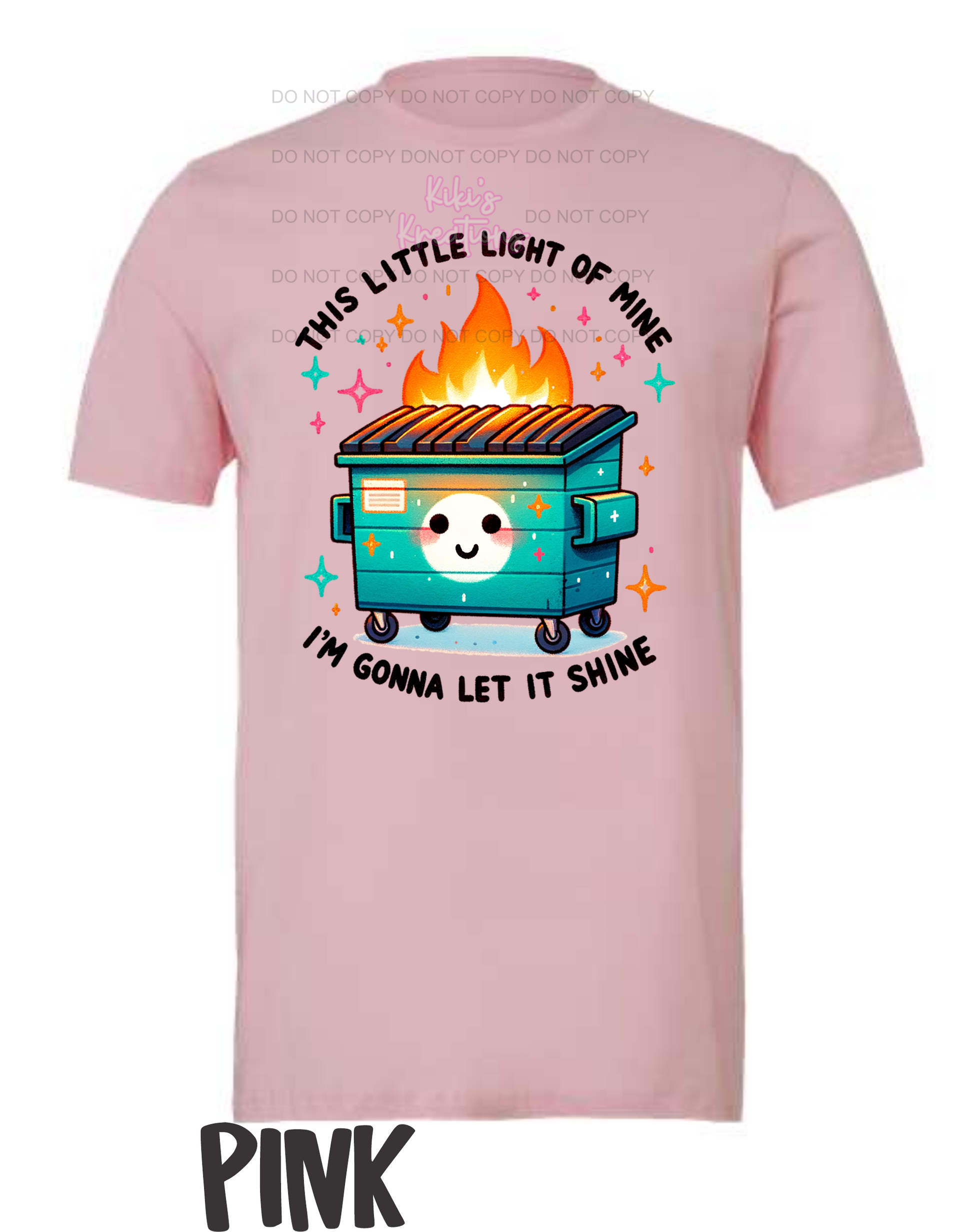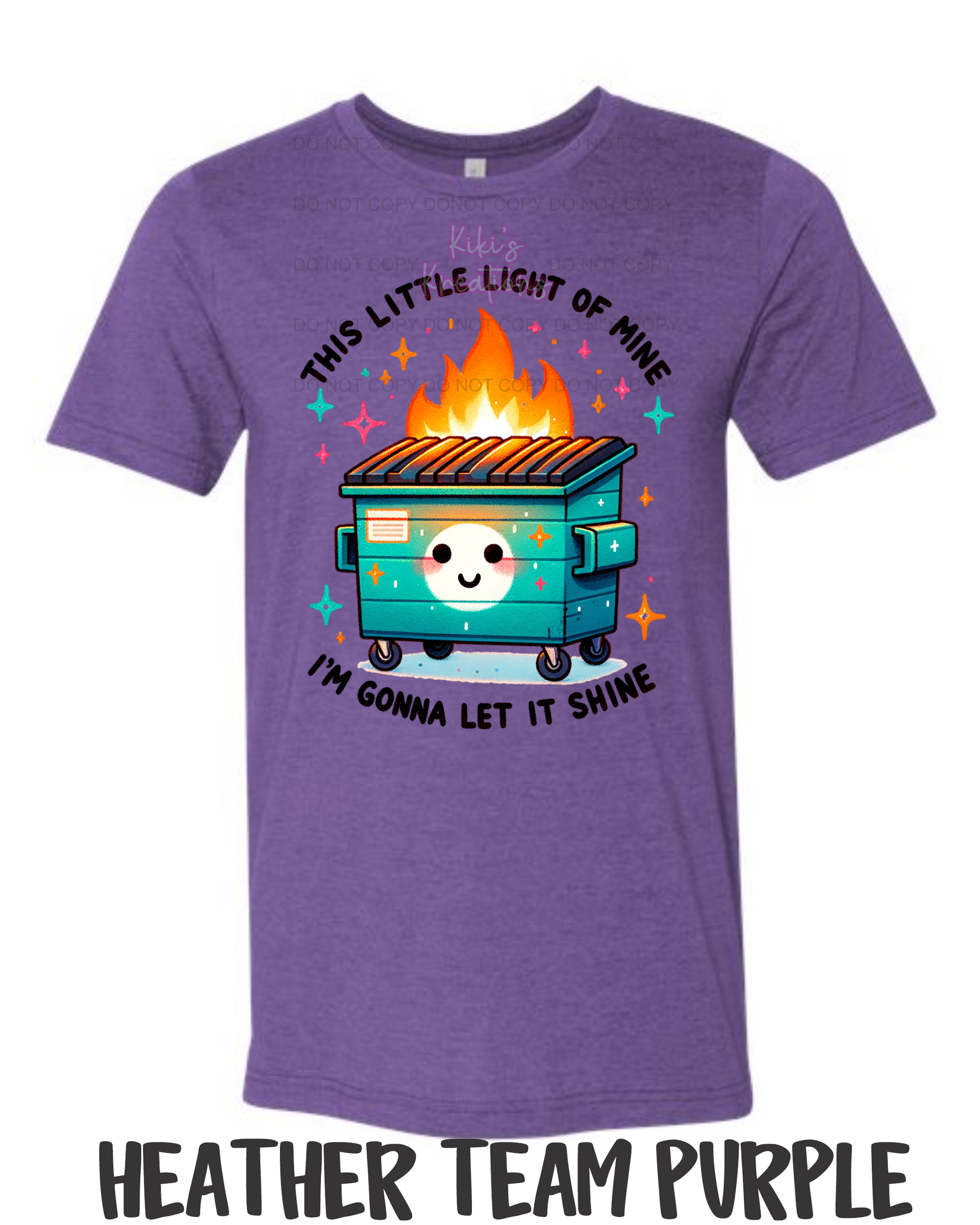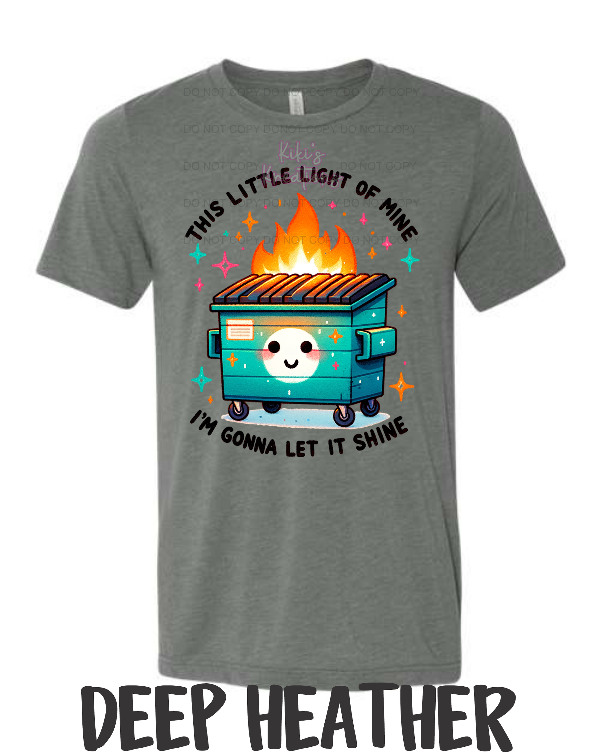 This Bella Canvas tee combines humor with a bold message. Featuring a playful "Dumpster Fire" graphic alongside the uplifting phrase "This Little Light of Mine, I'm Gonna Let It Shine," it adds a witty twist to a classic expression of positivity. Crafted from soft, high-quality fabric, this shirt offers both comfort and durability, making it perfect for everyday wear or as a conversation starter. Ideal for those who appreciate clever design and want to showcase their bright spirit with a touch of sarcasm.
