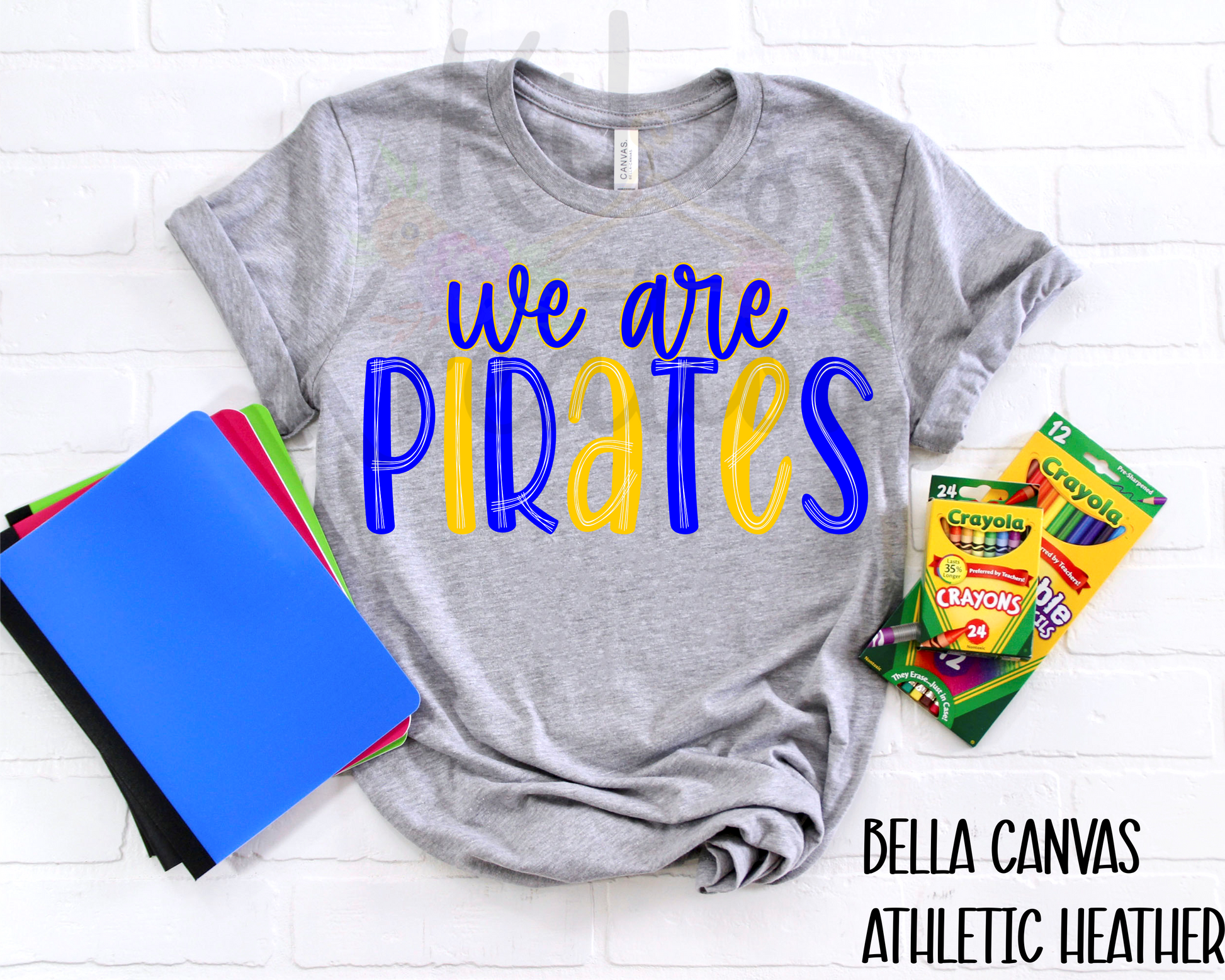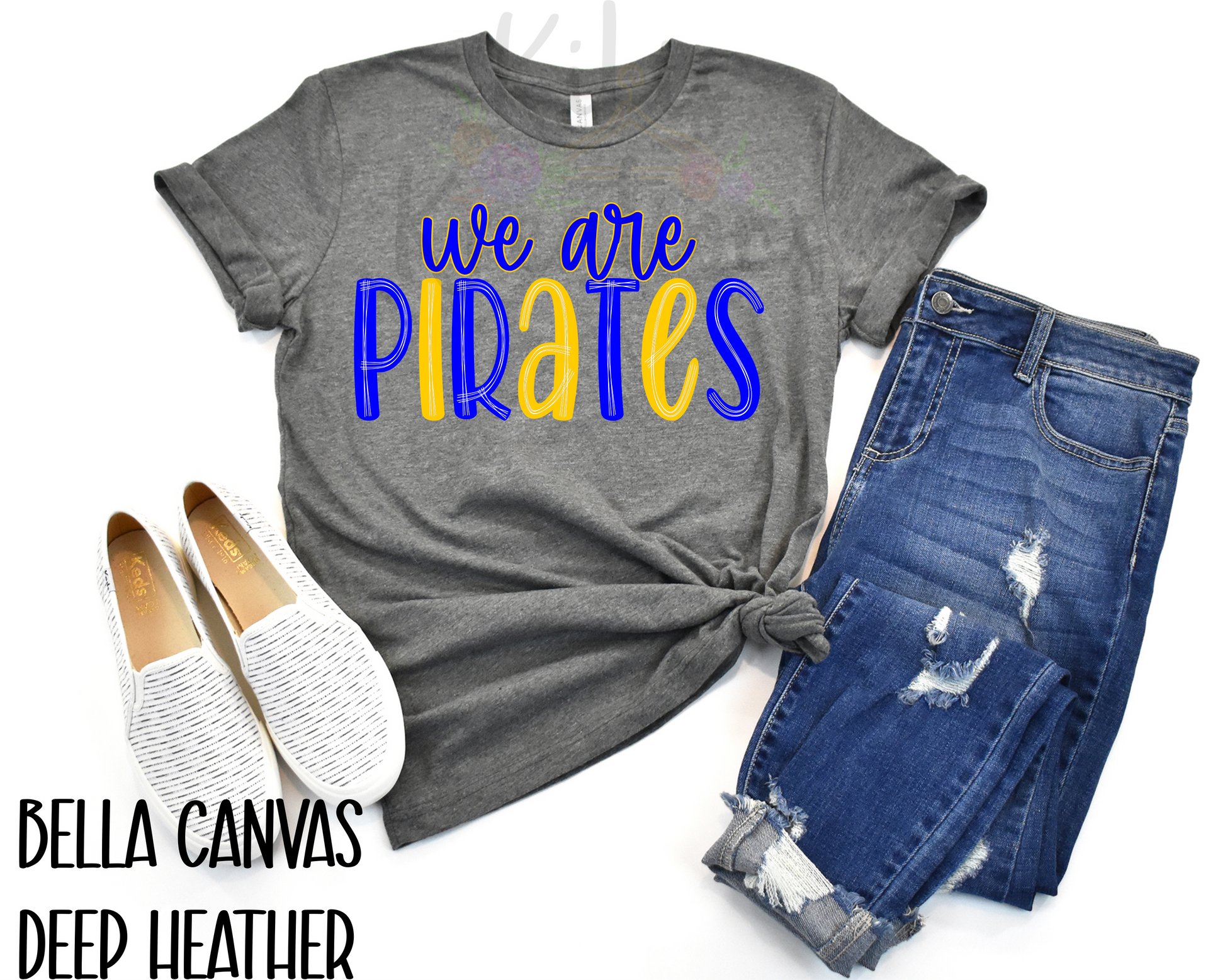 This stylish WE ARE PIRATES BELLA CANVAS TEE is perfect for showing your school spirit. Its classic blue and gold make it the perfect addition to any fan's wardrobe. Get ready to jump on board with this one-of-a-kind design.