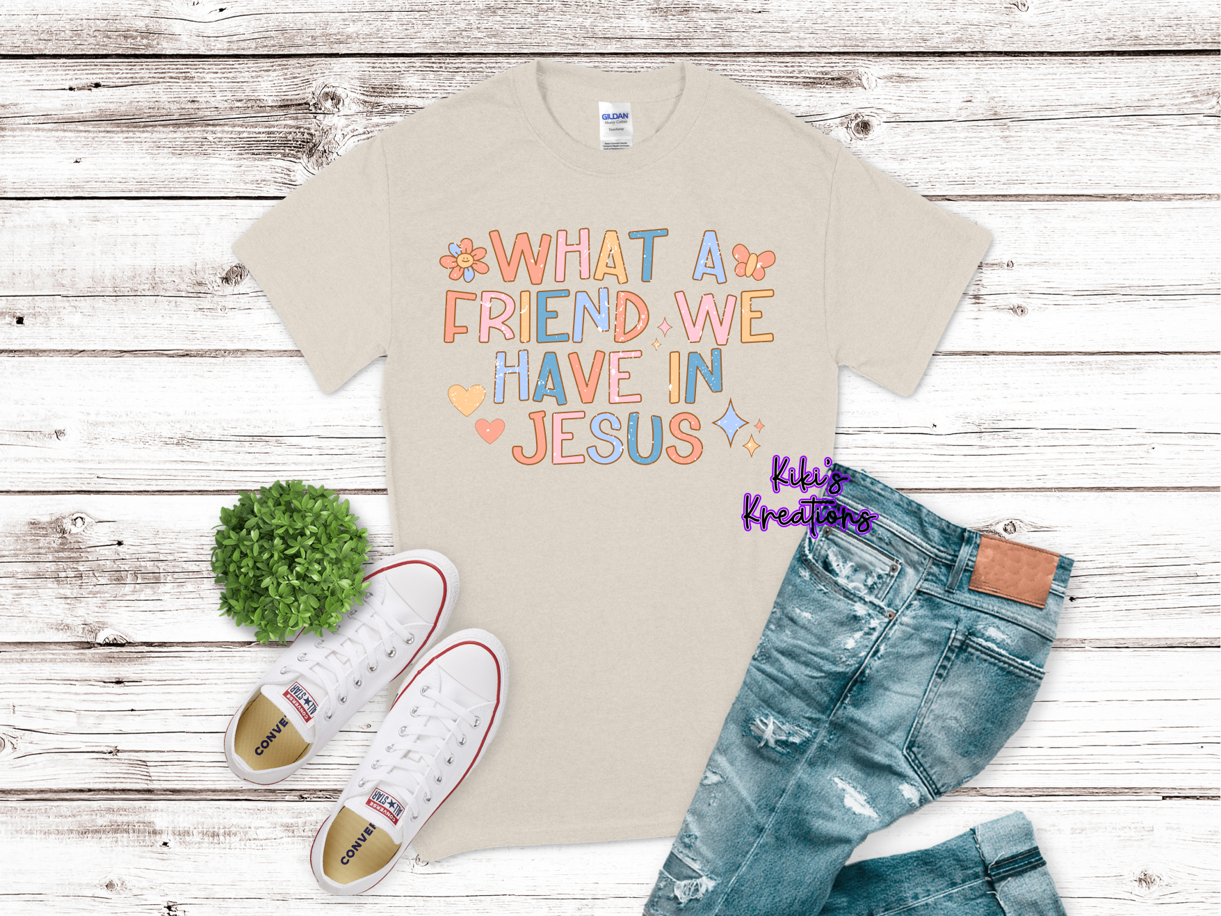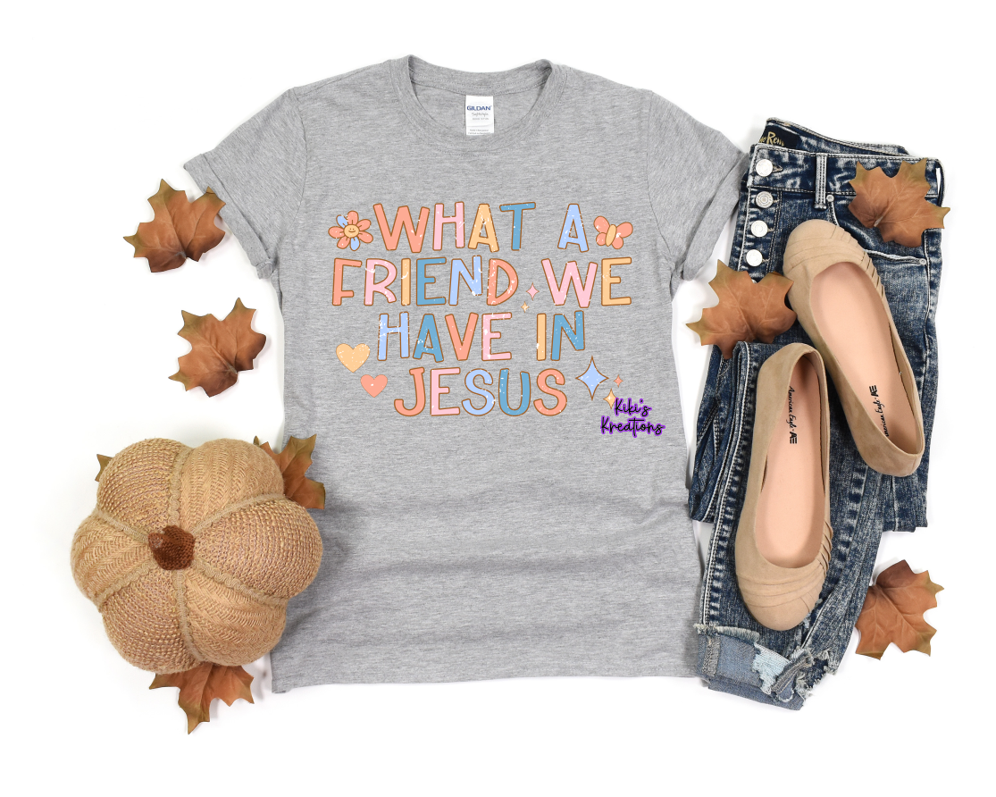 Discover the uplifting message behind our WHAT A FRIEND WE HAVE IN JESUS tee in GILDAN SOFTSTYLE. This tee features whimsical colors and a distressed design, perfect for anyone looking for a comfortable and stylish reminder of their faith. Spread positivity and showcase your love for Jesus with our tee.